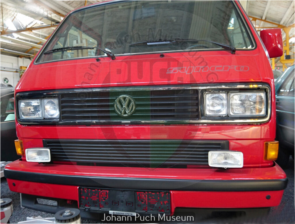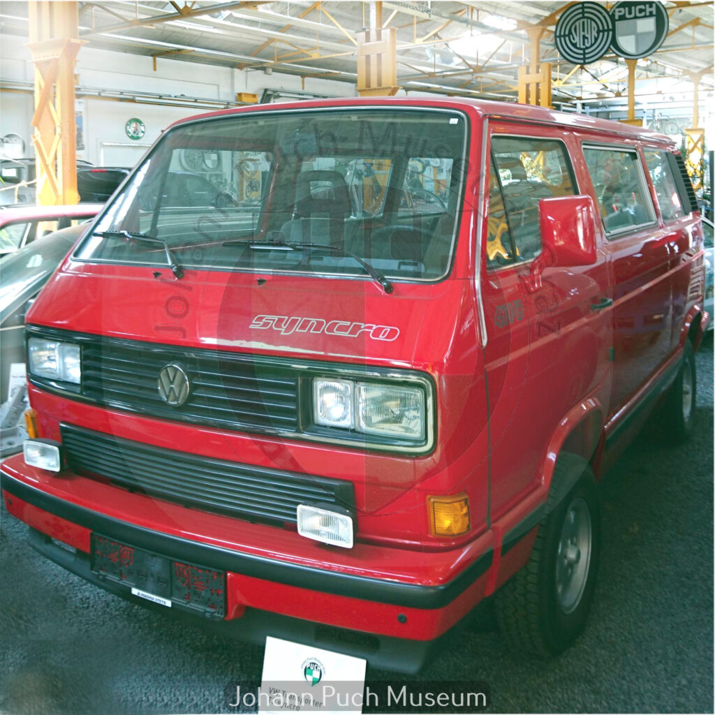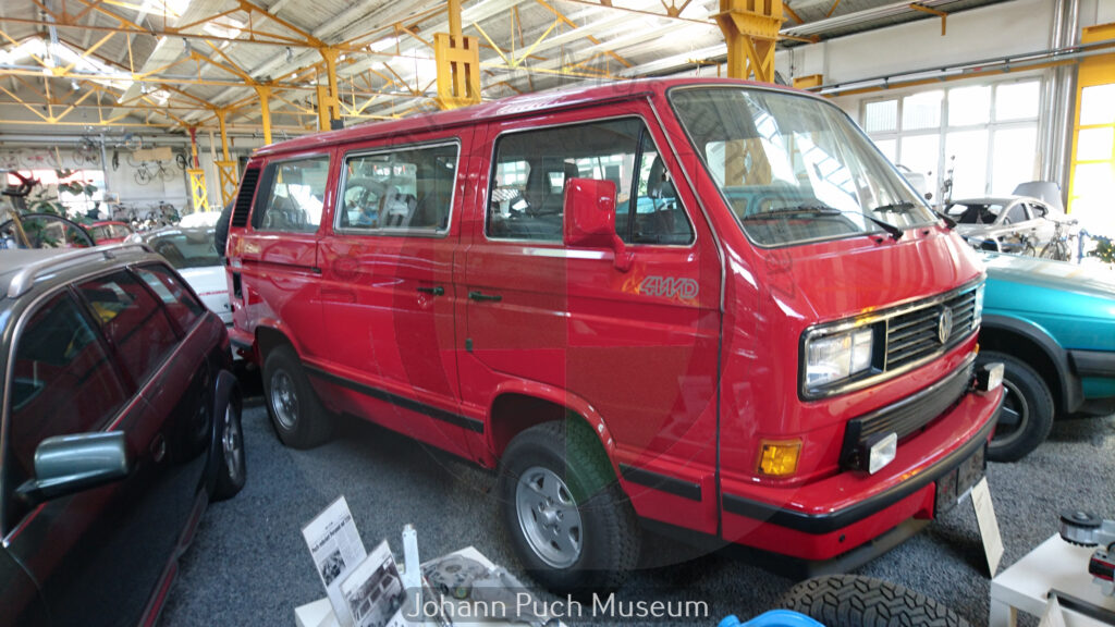 Im Museum ist der letzte in Graz gebaute T3 Synchro ausgestellt. Der VW T3 Synchro wurde von 1984 – 1992 in Graz gebaut. Auch die Auslauffertigung des VW T3 mit 4×2 Antrieb erfolgte in Graz.